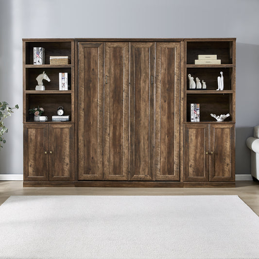 Full Size Self-Close and Open Murphy Bed with 2 Side Cabinet Storage Shelf, Brown